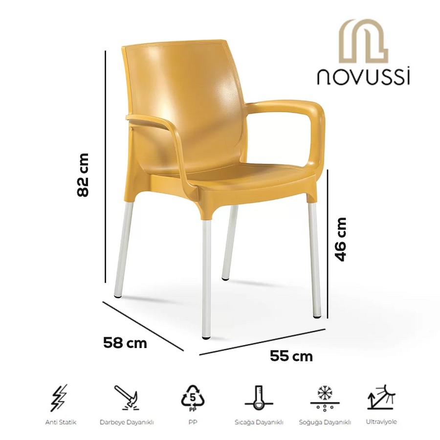 Bu sandalye, dayanıklılığı artırmak için orijinal PP'ye fiberglas eklenerek yapılmıştır. Güneş ışınlarına ve renk solmasına karşı UV korumalıdır. Antistatik ve antioksidan katkı maddeleri sayesinde ürünlerimiz toza, elektriklenmeye, asit yağmuruna ve paslanmaya karşı korunmaktadır. Hem kapalı hem de açık mekanlar için kullanılabilir.